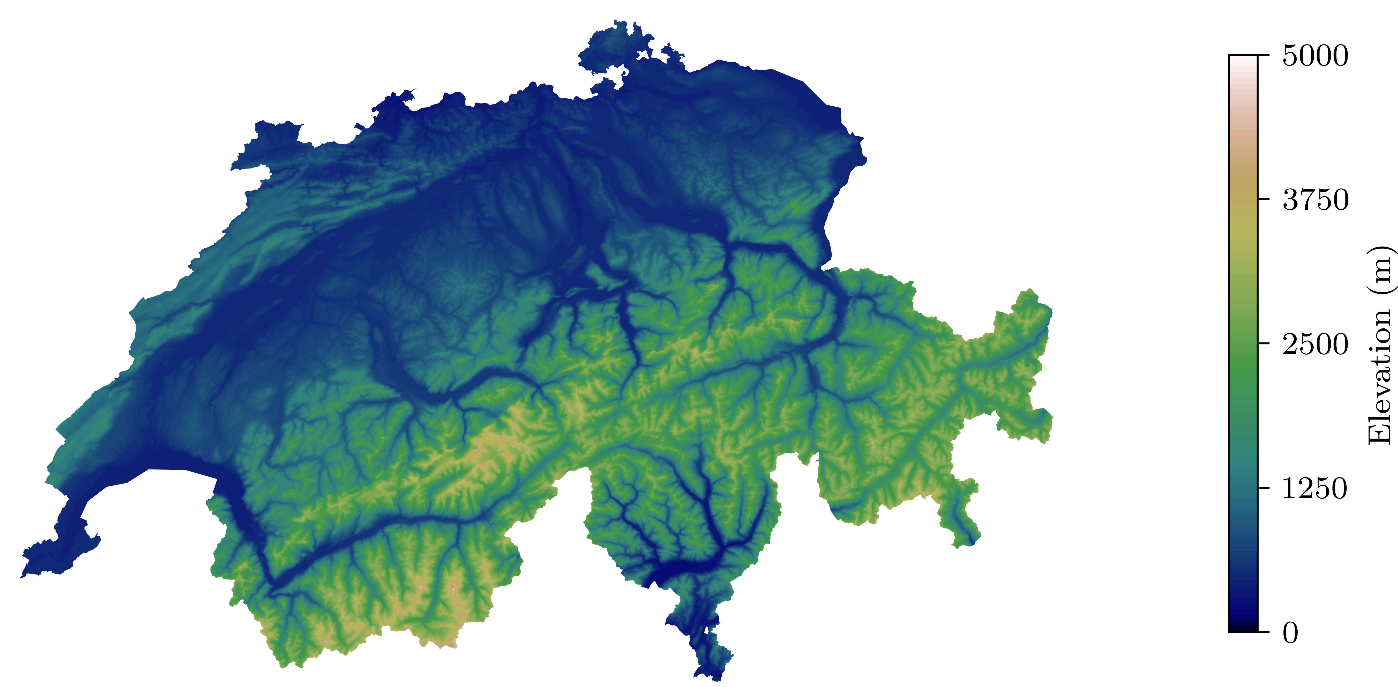 Switzerland is well known for it’s mountains, covering roughly 70% of the country’s total area. L’Office fédéral de topographie (swisstopo) has increadibly high-resolution elevation data (grid with spacing 25x25 meters) for the country. This can be used to generate beautiful elevation plots, like the one on the cover of this post.